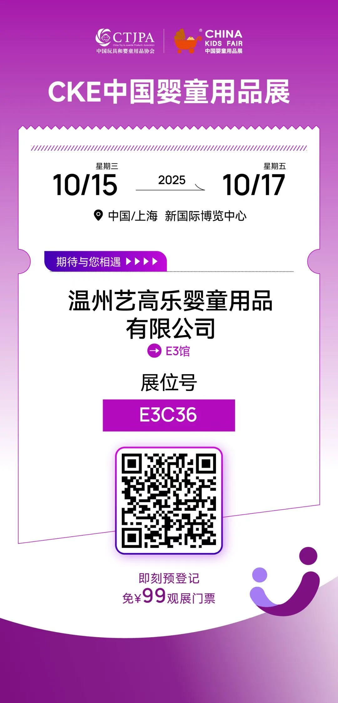 对于渠道商而言,这不仅是一次近距离接触优质童车的机会,更是深入了解行业趋势、寻觅合作商机的绝佳平台。提前预登记,即可免99元门票。10月15日-17日,中国婴童用品展E3馆,一同探索婴童世界的无限可能。